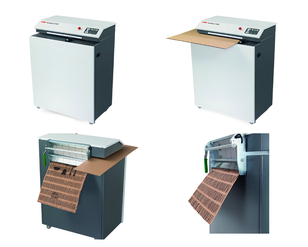 The HSM ProfiPack P425 perforates up to 2-3 layers of cardboard into cushioned filling material. Its steel-hardened cutting rollers ensure durability and precision. Built-in safety features like an emergency stop make it reliable and secure. It also offers voltage options of 120V and 208V to suit different operational needs. With mobility on steering rollers, it’s ideal for warehouses and shipping zones.